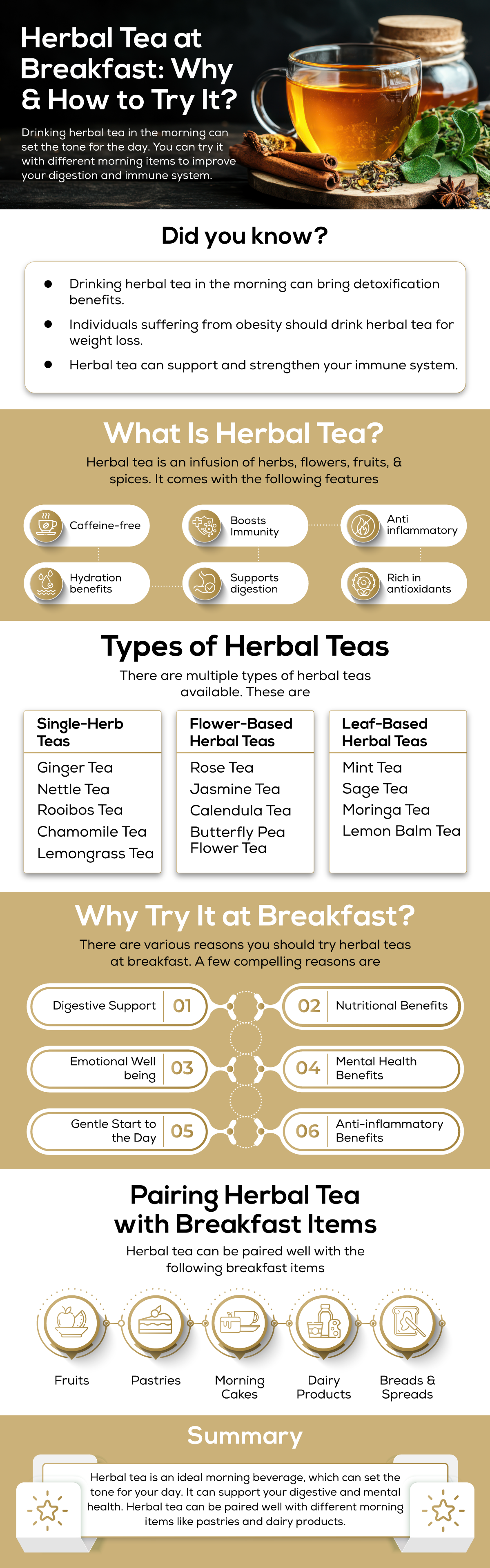 Herbal tea is an ideal morning beverage, which can set the tone for your day. It can support your digestive and mental health. Herbal tea can be paired well with different morning items like pastries and dairy products.