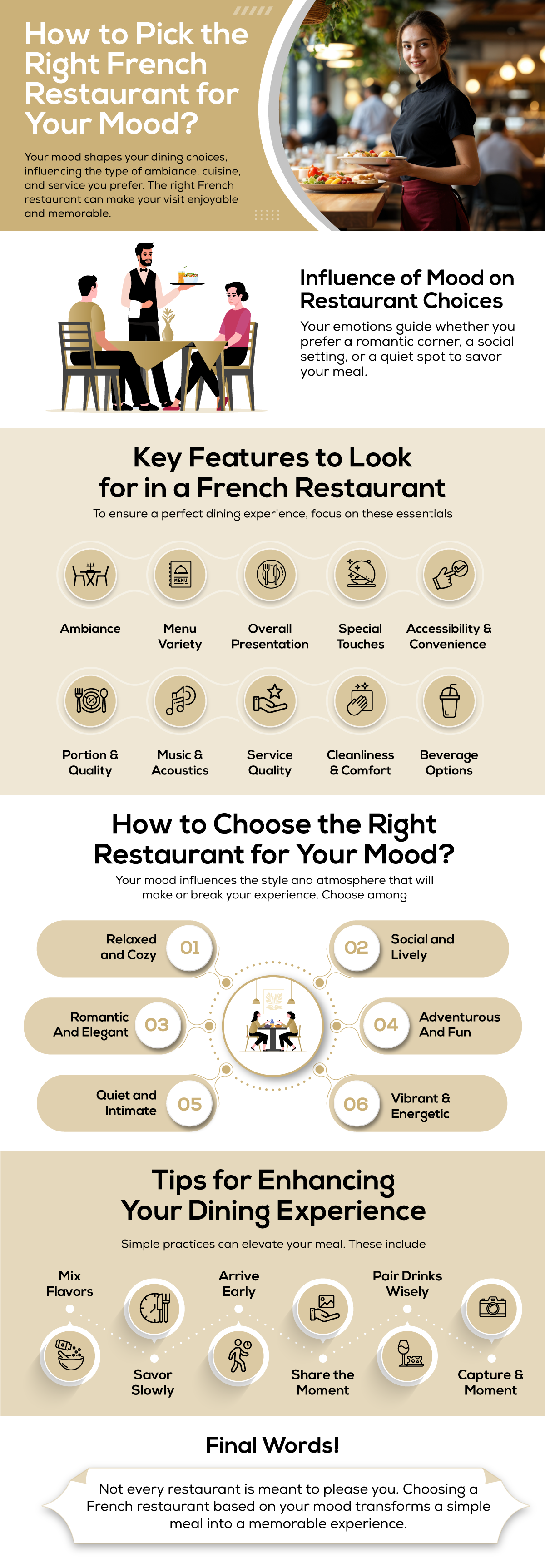 Your mood shapes your dining choices, influencing the type of ambiance, cuisine, and service you prefer. The right French restaurant can make your visit enjoyable and memorable.